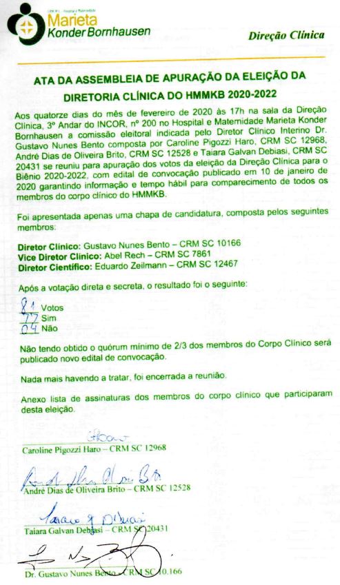 Resultado da eleição da Direção Clínica de Fevereiro de 2020